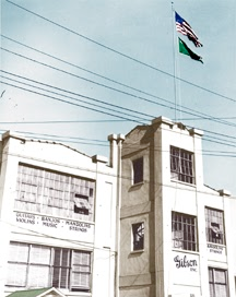 The Gibson factory at 225 Parsons Street, Kalamazoo, Michigan, ca:1940. Heralding a 48-star American flag, and getting into full swing before the War years, Gibson’s signage (on both the left and right face of the building) boasts “guitars, banjos, mandolins, violins, music, and strings.” Banjo and mandolin production continued in this facility, kindly referred to by Gibson employees as “the old building,” until Gibson moved its operations to Nashville in 1984. The building still stands, today. (The photo, originally black and white, has been color enhanced for this web page.)