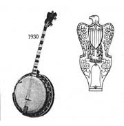 A richly- decorated banjo model with a carved and colored eagle on the resonator back, and a three-dimensional eagle carved on the peghead. The fretboard was hand-painted with scenes depicting the development of American history. Gold-plated engraved hardware, pearloid fretboard, burl walnut and white holly woods.
