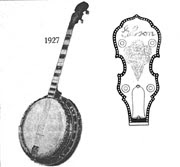 The style -5 was available in two distinct models. First as one of the early “trap-door” and Pyralin resonator banjos. The tone chamber at that time was the plain ball-bearing type. Fretboard inlay pattern was a fancy floral pattern, and the hardware was gold-plated. In 1925 with the introduction of the spring-loaded ball-bearing tone chamber, this style was introduced with a full resonator, “wreath” inlay design, gold-plated and engraved hardware, figured walnut neck and resonator wood, ivroid binding, wood-inlay marquetry on the back of the peghead, and fancy purfling.