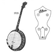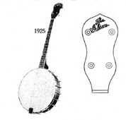 This banjo was introduced in 1922 with nickel plating, an ebony fretboard with pearl dots, and a “trap door” resonator. In 1925 the fretboard was changed to rosewood with fancy inlay shapes, the resonator was deleted, and a 10-1/2″ head was featured. In 1926, the style changed to a full-resonator model with shoes-and-plate flange and an 11″ head. In 1930 it further changed to a dark mahogany (stain over maple) finish, and “bat” inlays, In 1936 the inlay pattern changed again to simple dots.