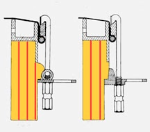 Fig 3. Shortly after the introduction of the ball bearing system, a lip (A) was machined into the rim’s side to support the tube (B), which replaced the shoes. The tube added greater structural stability to the rim (acting as a hoop on a barrel) and assured that the laminates would not separate. The hooks were still the flat design, but the nuts (1/4″ hexagonal) were changed to a more elongated shape.