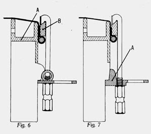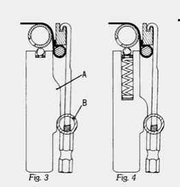 Fig 4 indicates the addition of springs beneath the ball bearings to further increase the resiliency. The outer profile of the rim’s lip was slightly changed to be more rounded and not as flat as (A) in Fig 3. As with the rims in Fig 3, the bracket nuts were the same elongated hexagonal 1/4″ nuts.