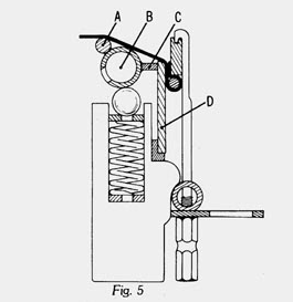 A major design change occurred in 1925 with the introduction of the modified ball bearing tone chamber (Fig. 5). A round rod (A), smaller in both diameter and circumference, was brazed onto the hollow tone tube (B). A second stamping (C) was brazed to the outside diameter of the tone tube to keep it centered within the outer support ring (D). [The early support rings were drilled with a staggered-hole pattern, which is visible from the outside of the banjo at position (D)]. Flat hooks were still used on this version, and the springs were larger than on previous models. The banjo head had two contact points, giving it the first “arch top” profile. Lastly, we see the introduction of the hexagonal 1/4″ bracket nut which is still currently used on Gibson banjos.