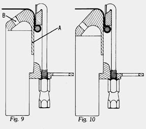 Fig. 9. In the early ’30s, a new tone chamber was designed to take advantage of the full 11″ head diameter. A cast tone chamber was prepared with a .655″-high lip (A) that could fit in place of the arch-top tone chamber (which had a lip of the same height). This design is often referred to as the “low-profile flattop tone chamber.” It was drilled with 20 holes (B).