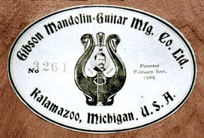 The original photo of Orville for the label can be seen at the very beginning of my introductory page on Orville Gibson (that lead you to this page). A round photo of it was graphically superimposed over a photo of the lyre mandolin to achieve the artwork in the label as shown above.