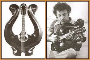 To construct the lyre mandolin, I cut the rim from a solid piece, rather than bending it (as specified in Orville’s early patent claims). The rim is 1-1/2″ high, as on most of Orville’s early instruments, the soundboard is Sitka spruce, and the backboard is African mahogany. The severely-arched soundboard offered no flexibility which resulted in the amplitude and tonal qualities being rather poor. The photo of me playing it, was taken in 1976.