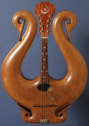 The above instrument is now in the permanent collection of the University of South Dakota Music Museum in Vermillion, SD. In October, 2007, I was invited to the museum to give a presentation on The Lore of Loar, and had a minute to stop and see Orville’s lyre mandolin. Photo courtesy George Gruhn.